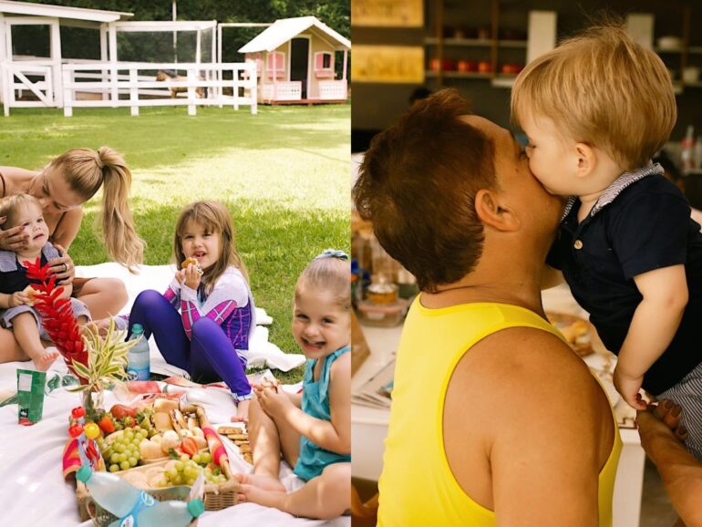 Nas redes sociais, Poliana compartilhou registros do momento em família. As imagens mostram toalhas estendidas na grama, mesa improvisada com hambúrguer, pão de queijo, frutas frescas, além de água e suco para as crianças.